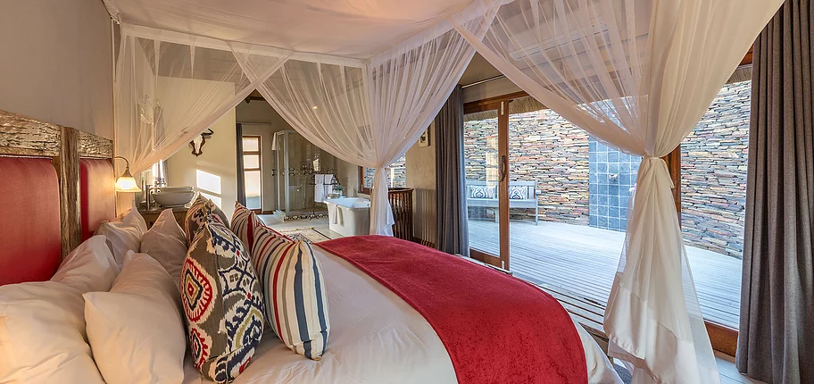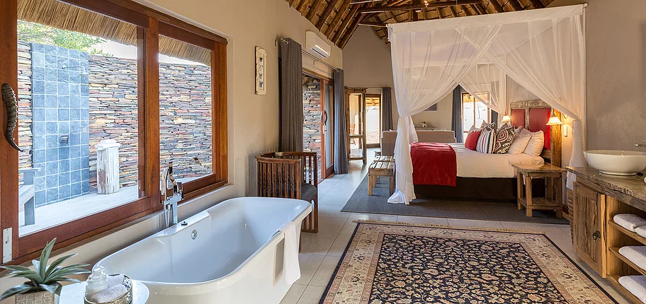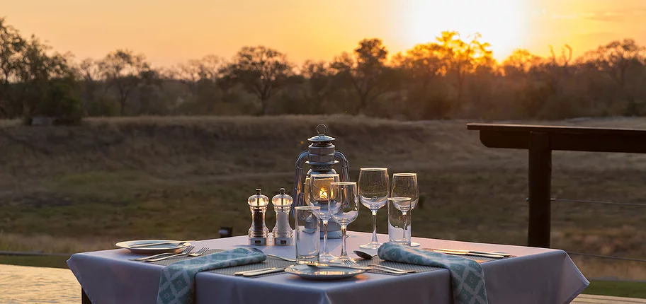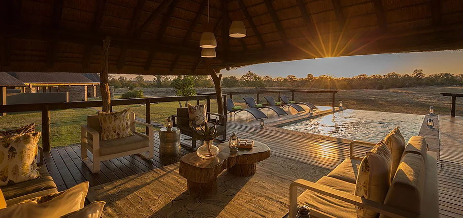 Designed to blend seamlessly into its natural surroundings, Arathusa offers luxury accommodations with an intimate and welcoming atmosphere. The main living areas are designed for relaxation, whether enjoying a book, sharing stories with fellow travelers, or simply soaking in the breathtaking views. An infinity pool overlooking the waterhole offers a refreshing way to experience the bush, while the traditional open-air boma provides a magical alfresco dining experience under the African night sky.