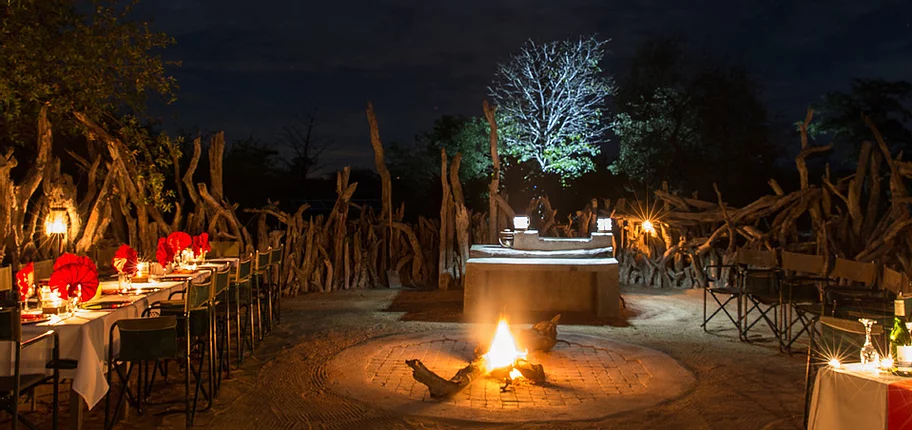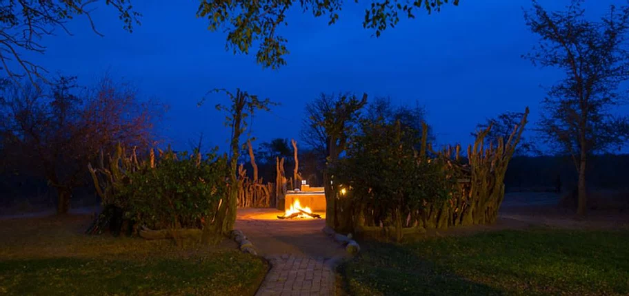 The lodge’s main building is conveniently located near the suites and features a well-equipped bar, lounge area, a small TV room with satellite TV and DVDs, free WiFi, guest bathrooms, a spacious dining room, and an office. Outdoor living includes a charming open-air boma with a cozy fireplace, perfect for evening gatherings. The lodge’s swimming pool overlooks the bush and a small waterhole, offering a peaceful spot to relax while observing local wildlife.