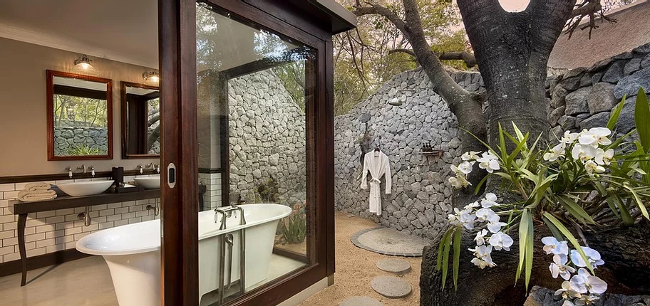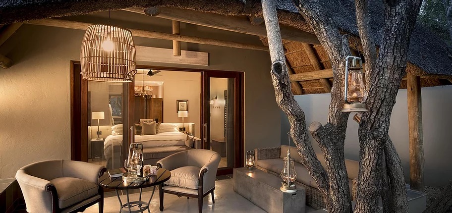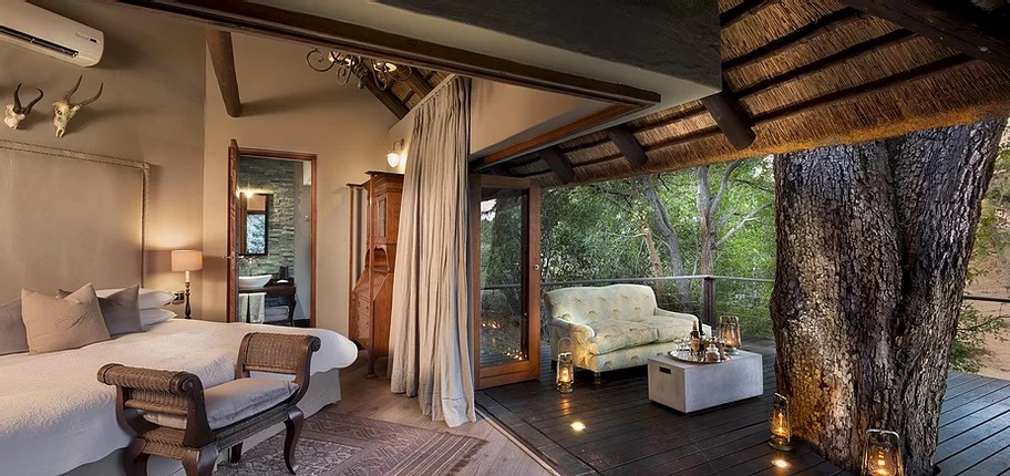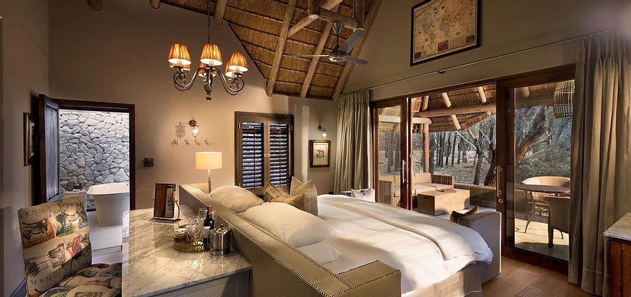 The lodge’s swimming pool overlooks a scenic riverine woodland, an oasis for both relaxation and birdwatching. Between safari excursions, guests can unwind with a spa treatment or stay active in the fully equipped fitness sala. Gourmet dining is a highlight, with hearty breakfasts and lunches served beneath the shade of an ancient Boer Bean tree, while evenings bring candlelit feasts in the courtyard or an authentic African boma experience under the open sky.