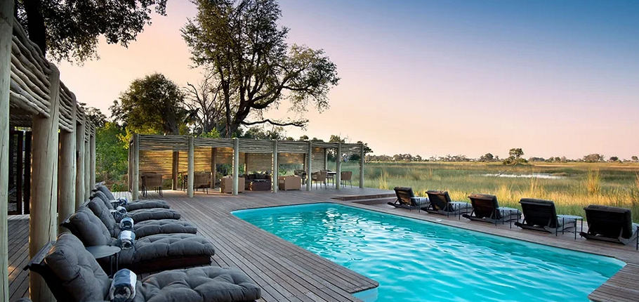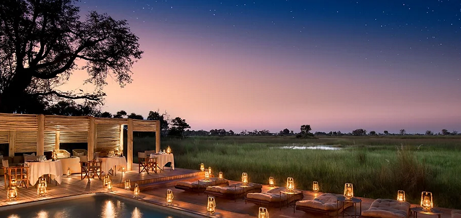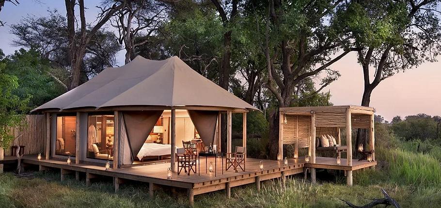 Nestled in a private 25,000-hectare concession in the heart of Botswana’s Okavango Delta, Siyeza Safari invites you to experience the untamed beauty of Nxabega Okavango Tented Camp. This intimate retreat features nine luxurious ensuite safari tents, each offering panoramic views of the Delta’s vast floodplains, winding channels, and shimmering lagoons. Elevated on wooden platforms beneath a canopy of ancient ebony trees, the tents provide a serene escape with their spacious layouts, plush furnishings, and seamless indoor-outdoor design.