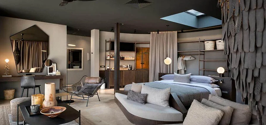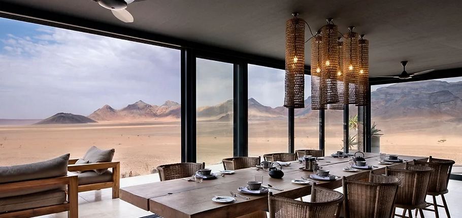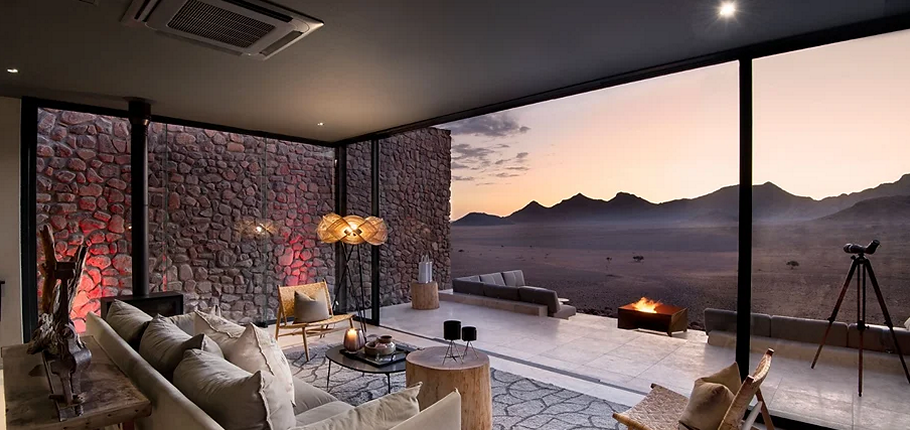 Designed to blend seamlessly with its surroundings, the lodge features 10 elegant stone and glass suites, each positioned for unobstructed desert views. Every suite offers: