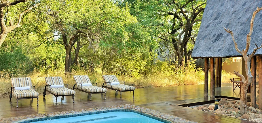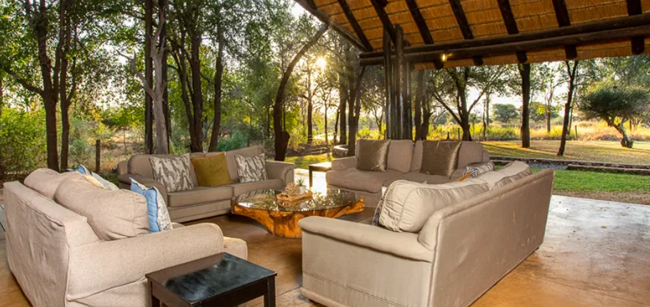 The lodge’s central gathering area overlooks a lively waterhole, a favorite spot for elephants, buffalo, and a wide variety of birdlife. This area invites guests to enjoy the outdoors and the vibrant wildlife that frequently visits. The open-plan lounge and dining areas flow seamlessly onto shaded timber decks, providing ideal spaces for relaxation and game viewing in a tranquil and comfortable environment.