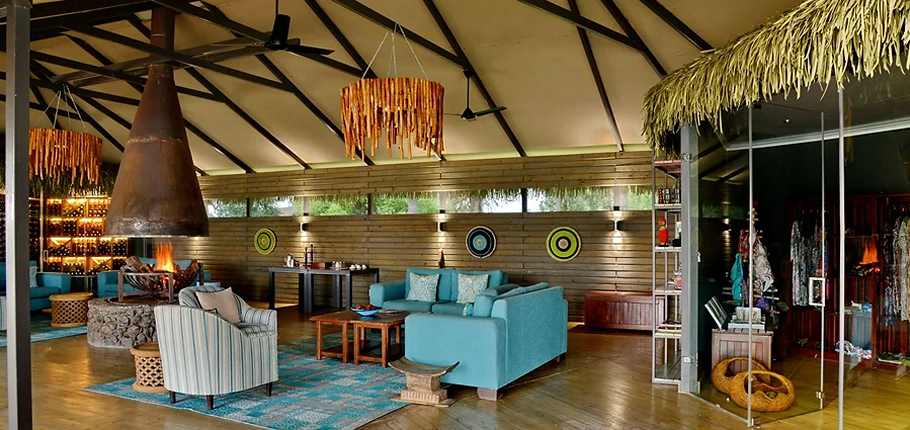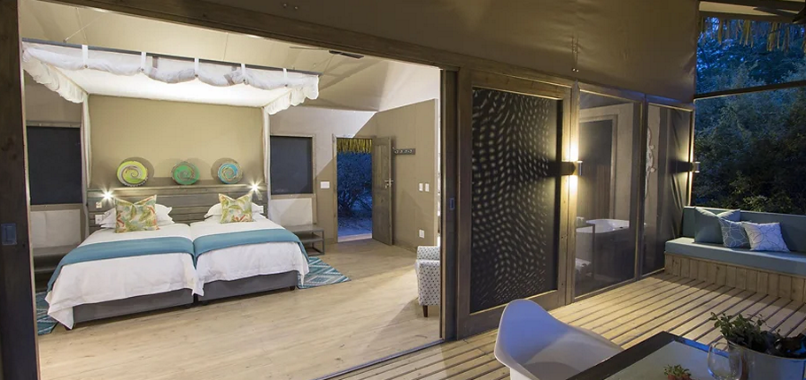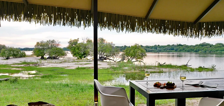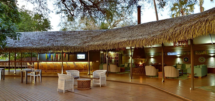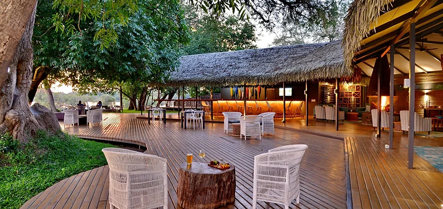 Designed with a blend of contemporary elegance and African authenticity, the main lodge features an open-plan reception, an inviting lounge, a stylish bar, an interleading swimming pool deck, and both indoor and outdoor dining areas. The natural Ilala palm roofs, wooden decking, and sophisticated canvas structures evoke a chic safari aesthetic while maintaining a sense of organic simplicity.
