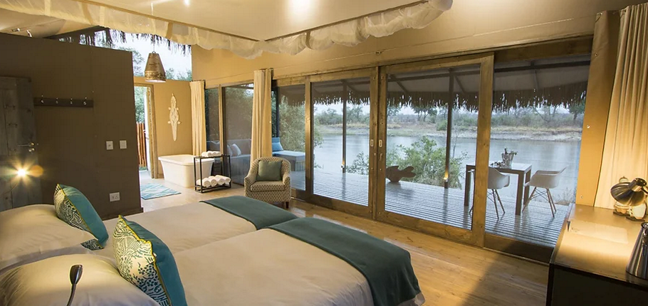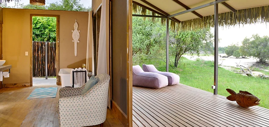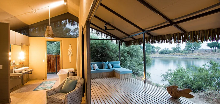 • Six River View Suites – Ideal for couples or solo travelers, these spacious suites feature either a super king or twin beds, an open-plan en-suite bathroom with a freestanding bath, and a private outdoor shower. Each suite extends onto a private deck with a comfortable daybed and seating area, offering uninterrupted views of the Zambezi River—perfect for morning coffee or an evening sundowner.