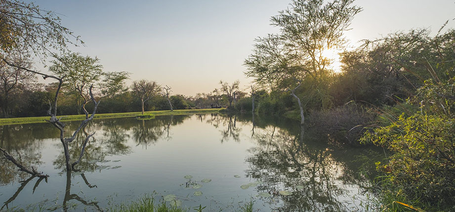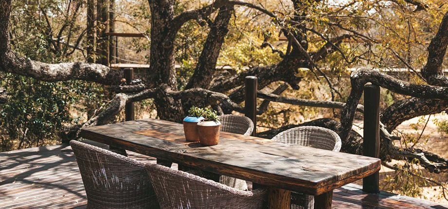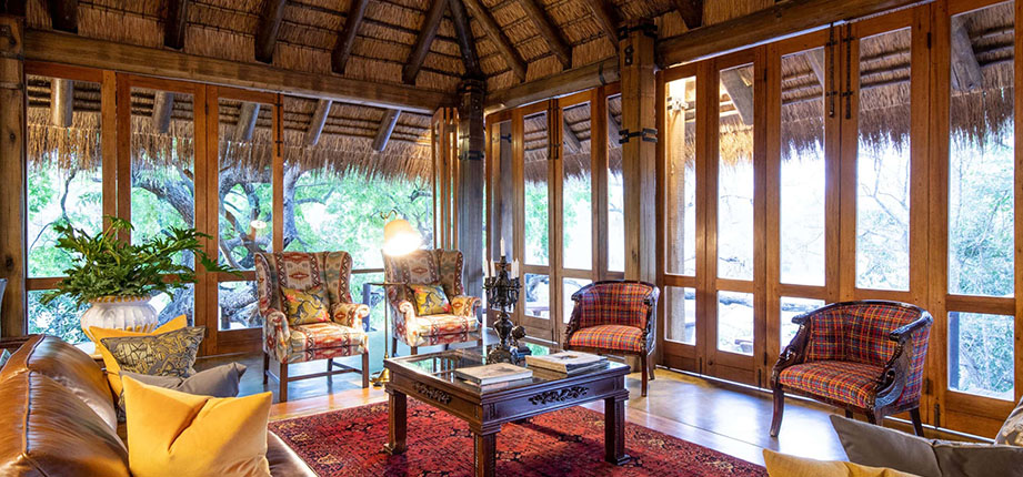Jabulani exudes the timeless charm of a classic safari lodge, blended with contemporary elegance and thoughtful design. The main lodge area is the heart of the retreat, featuring a sophisticated dining room, an inviting lounge, and a spacious wooden deck shaded by majestic Leadwood trees. Here, guests can savor gourmet alfresco meals while enjoying uninterrupted views of a nearby waterhole, where wildlife gathers.