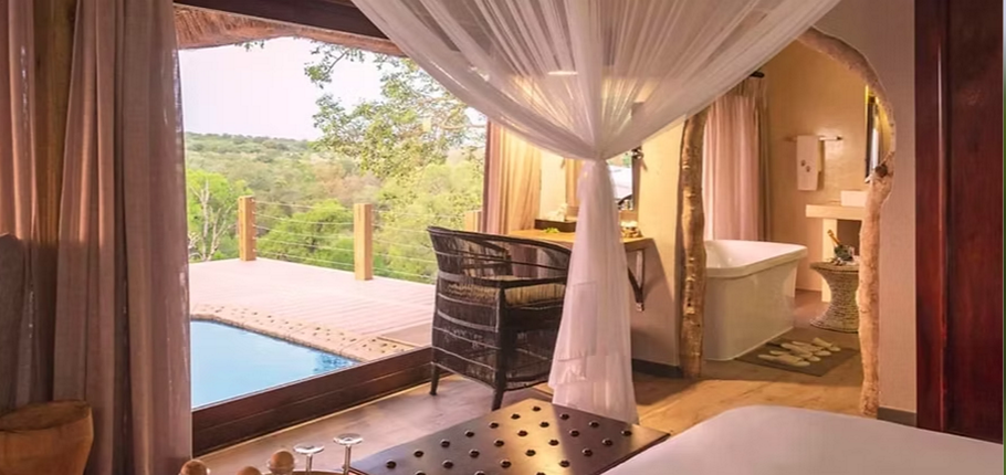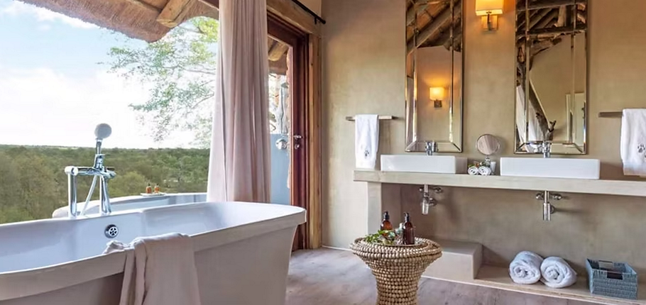 At the main lodge, guests can enjoy a beautifully curated library with complimentary Wi-Fi, a traditional Shangaan boma for fireside dining, a wine cellar with rare South African vintages, and a stylish curio shop featuring handmade local crafts.