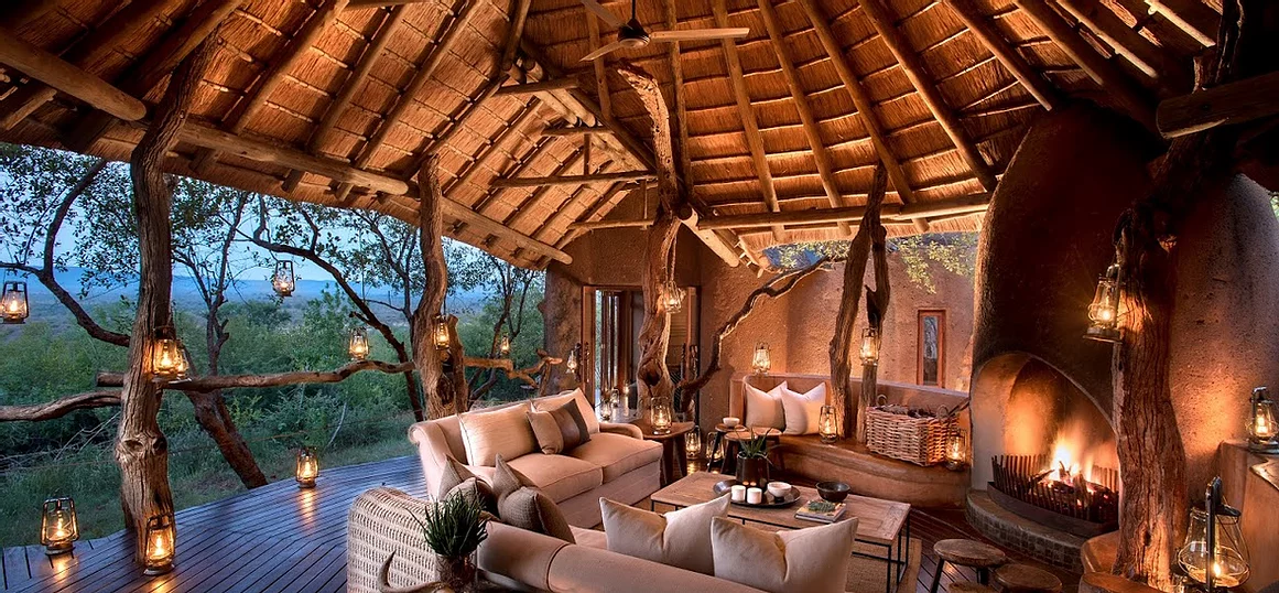 Spacious communal areas including an indoor lounge with a fireplace, a library, dining areas, and an outdoor boma for stargazing and storytelling.