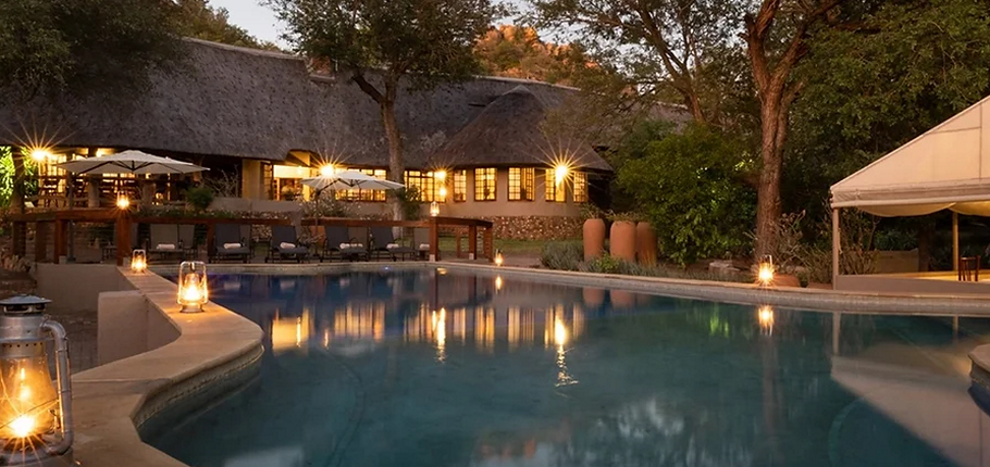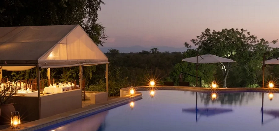 The poolside area is designed for relaxation, featuring comfortable sun loungers and shaded seating, allowing you to soak in the breathtaking beauty of the African wilderness. As the day unfolds, watch as the setting sun casts a golden glow over the landscape, turning an ordinary afternoon into an unforgettable safari moment.