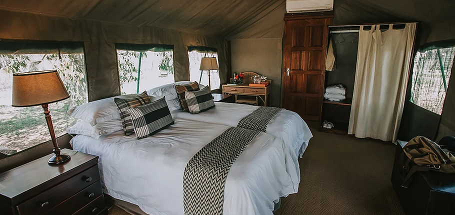 Nkelenga offers three Meru-style safari tents, each raised on wooden platforms and fitted with air-conditioning for year-round comfort. These canvas havens come with shaded private decks that overlook the active dam, allowing for tranquil wildlife viewing throughout the day. The tents are fully en-suite, each with a shower, basin, and toilet. One tent features a king-sized bed, while the other two are twin-bedded – ideal for couples or children. For cooler nights, electric blankets add an extra layer of cozy warmth.