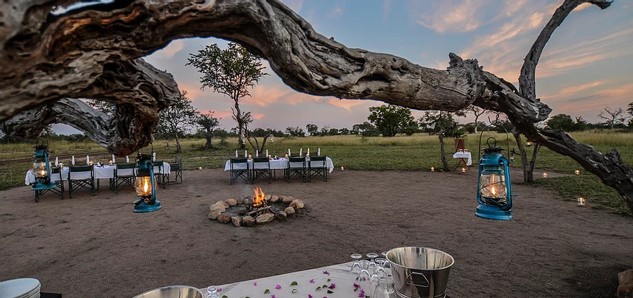 Enjoy a daily rhythm that’s both invigorating and calming. Start your day with a hearty breakfast beneath a thatched dining deck, overlooking the sweeping plains where wildlife often wanders by. Lunches and sundowners are a relaxed affair, while dinner is served around a crackling fire in our atmospheric leadwood boma—a truly African experience under the stars.