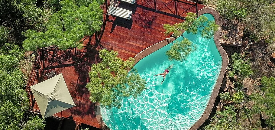 The main lodge includes an inviting swimming pool, comfortable lounging areas, and an elevated hide overlooking a busy watering hole—perfect for armchair game viewing with a drink in hand.