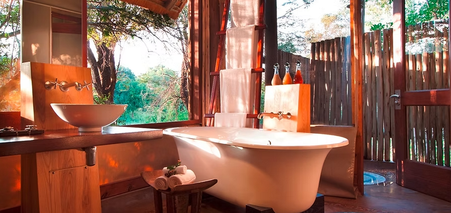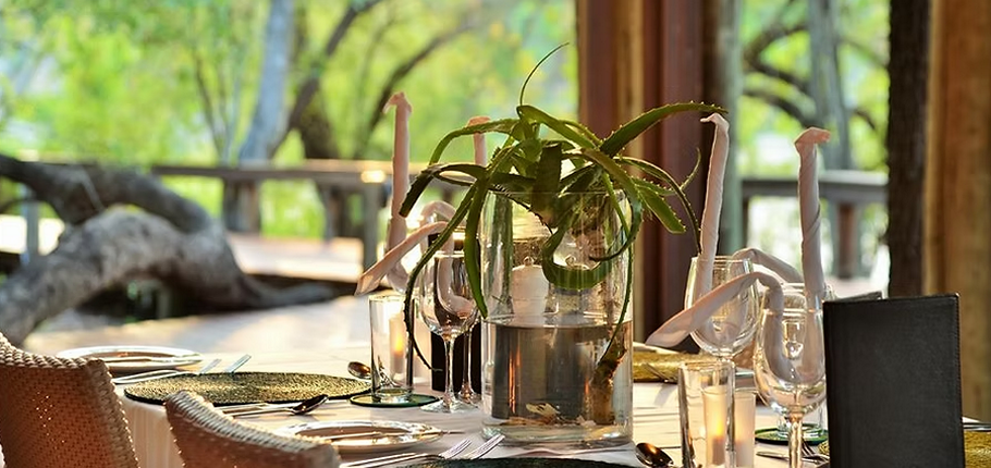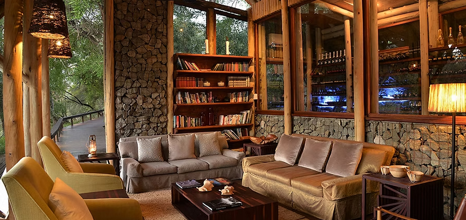 At the heart of the lodge is a stylish yet relaxed main area, where a swimming pool and full-service bar overlook a bustling waterhole—a favourite gathering spot for Kruger’s wildlife. The lodge’s talented chefs serve brunches, high teas, and three-course dinners, combining South African flair with fresh, seasonal ingredients. Meals are often enjoyed al fresco under a canopy of stars or in the communal dining area with panoramic bushveld views.
