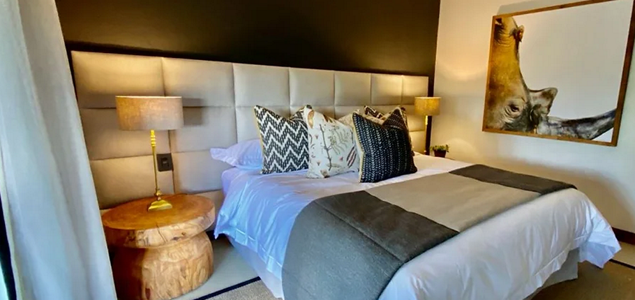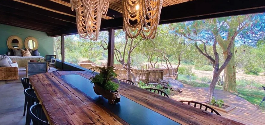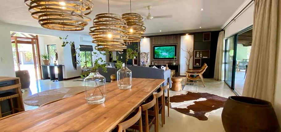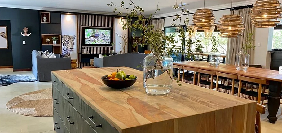 The Homestead features a spacious, beautifully designed open-plan living area, combining luxury, functionality, and comfort. The gourmet kitchen is fully equipped for self-catering and communal cooking, while the elegant dining and lounge spaces offer the perfect setting for shared meals, relaxation, and storytelling after a day in the bush.