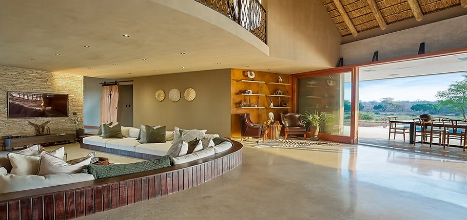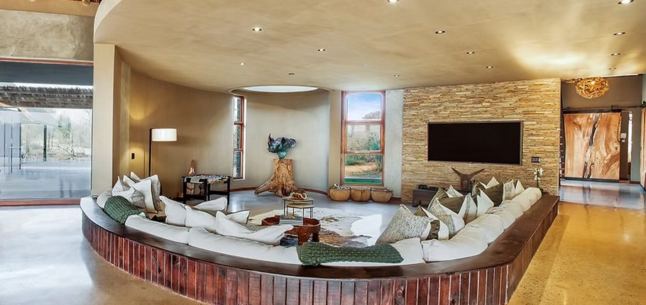 The lodge’s open-plan living area is a haven of sophistication and relaxation, featuring: