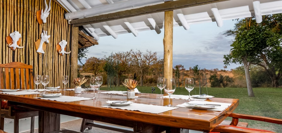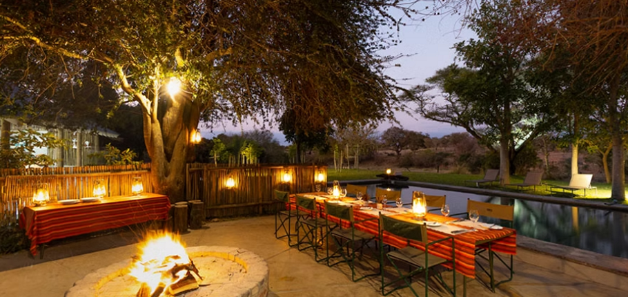 The lounge, bar, and dining area are all set within a beautiful open-plan space that allows the fresh bushveld air and sounds of the wild to flow through. With plush seating, a cosy fireplace, and uninterrupted views of the surrounding trees and river, it’s the perfect place to relax between safaris or connect with friends and family.