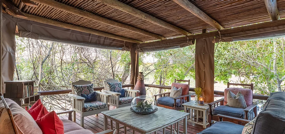 Tucked deep within the southern Thornybush Game Reserve, Waterbuck Lodge offers a front-row seat to the wild. The elevated main deck, shaded by ancient trees and overlooking a bustling waterhole, is the heart of the lodge—perfect for watching herds of elephant, antelope, or even the occasional predator stop by for a drink.
